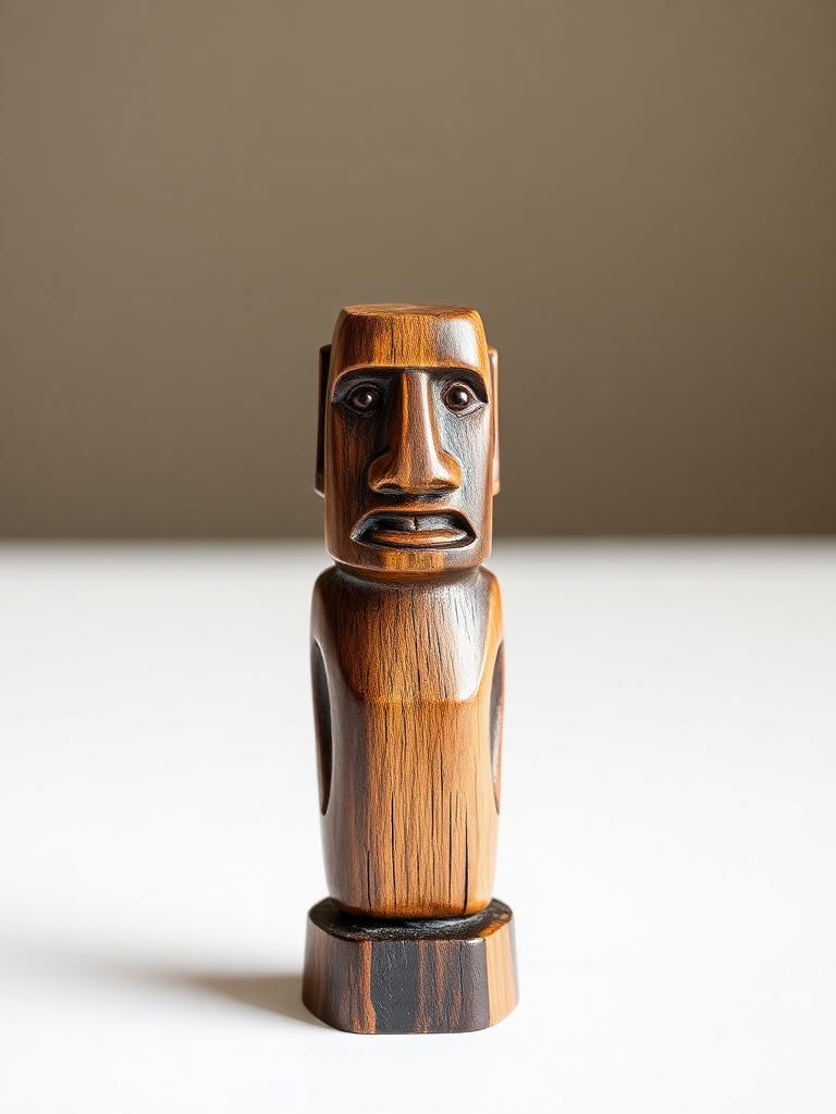 Figura de Moai tallada en madera con acabados en tonos oscuros. Perfecta para decorar escritorios o espacios pequeños. Representa la tradición artesanal de Isla de Pascua.